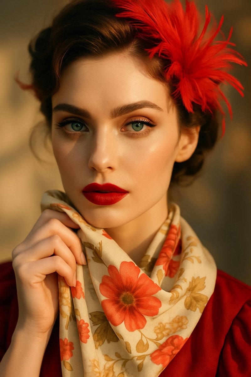 Close-up of a fashionable woman with striking emerald eyes, adorned with a vibrant feather fascinator, bold red lipstick, holding a delicate silk scarf with floral patterns, soft focus on her porcelain skin, golden hour lighting enhancing her features.