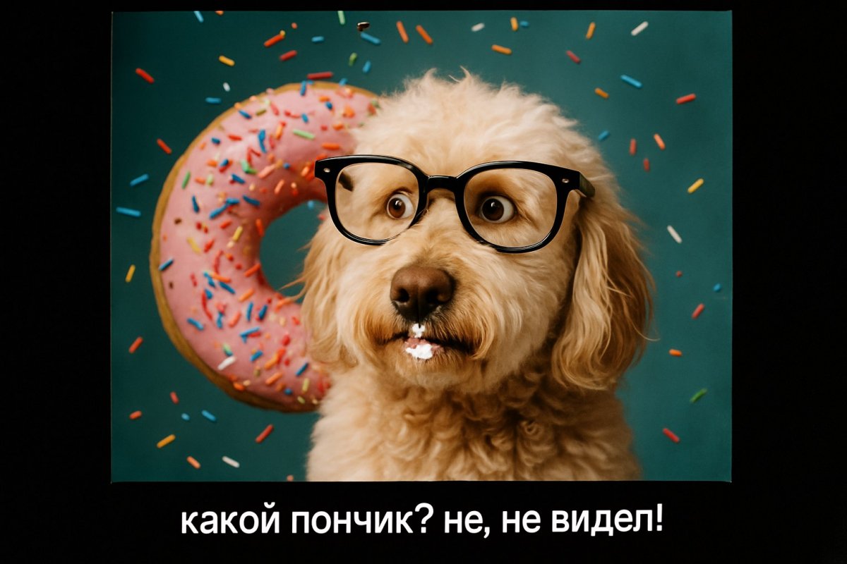 1. photo on film, black frame, text in white letters on the black frame: "Какой пончик? Не, не видел!", a fluffy dog wearing oversized glasses, sitting in front of a giant donut, with frosting on its snout and a confused expression. Vibrant sprinkles flying through the air.
