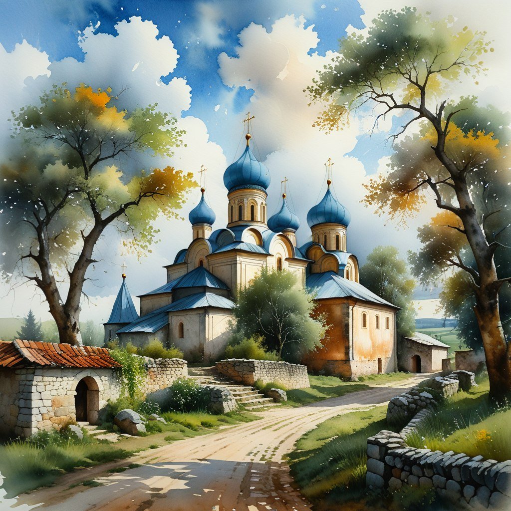 stable diffusion Русская деревня в стиле Степана Колесникова: старый монастырь и объятия природы. Картинка из нейросети Stable Diffusion
