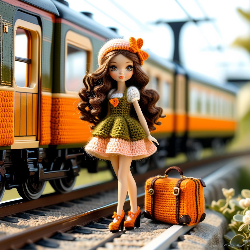 Волшебная фантазия в стиле флюид арт представляет собой изящную карикатуру на антропоморфную бимбо, запечатленную в эффектной позе. Длинные каштановые волосы обрамляют лицо юной, милой и кокетливой девушки, выполненной в виде миниатюрного вязаного изделия с объемными деталями. Её платье напоминает железнодорожный состав, создавая ощущение движения и приключения. Прекрасные ноги, изящные каблучки и чемодан добавляют образу завершенность, намекая на путешествие или ожидание поезда. Цветовая палитра – это гармоничное сочетание золотого, экрю, оливкового и персикового оттенков, выполненных в технике фетрового шелка и мохера. Все элементы словно переплетены между собой, создавая ощущение хрупкости и грации. Это не просто изображение, а сказочный мир, сотканный из фантазии и немного магии, где красота и легкость сочетаются с очарованием рукотворного искусства. Картина излучает атмосферу беззаботности и приключения, приглашая зрителя окунуться в волшебную реальность этой необычной героини. Детализированная работа подчеркивает мастерство исполнения, а мягкие текстуры создают ощущение тактильного контакта с изображением. Это поистине уникальное произведение искусства, которое способно вызвать восхищение и вдохновение