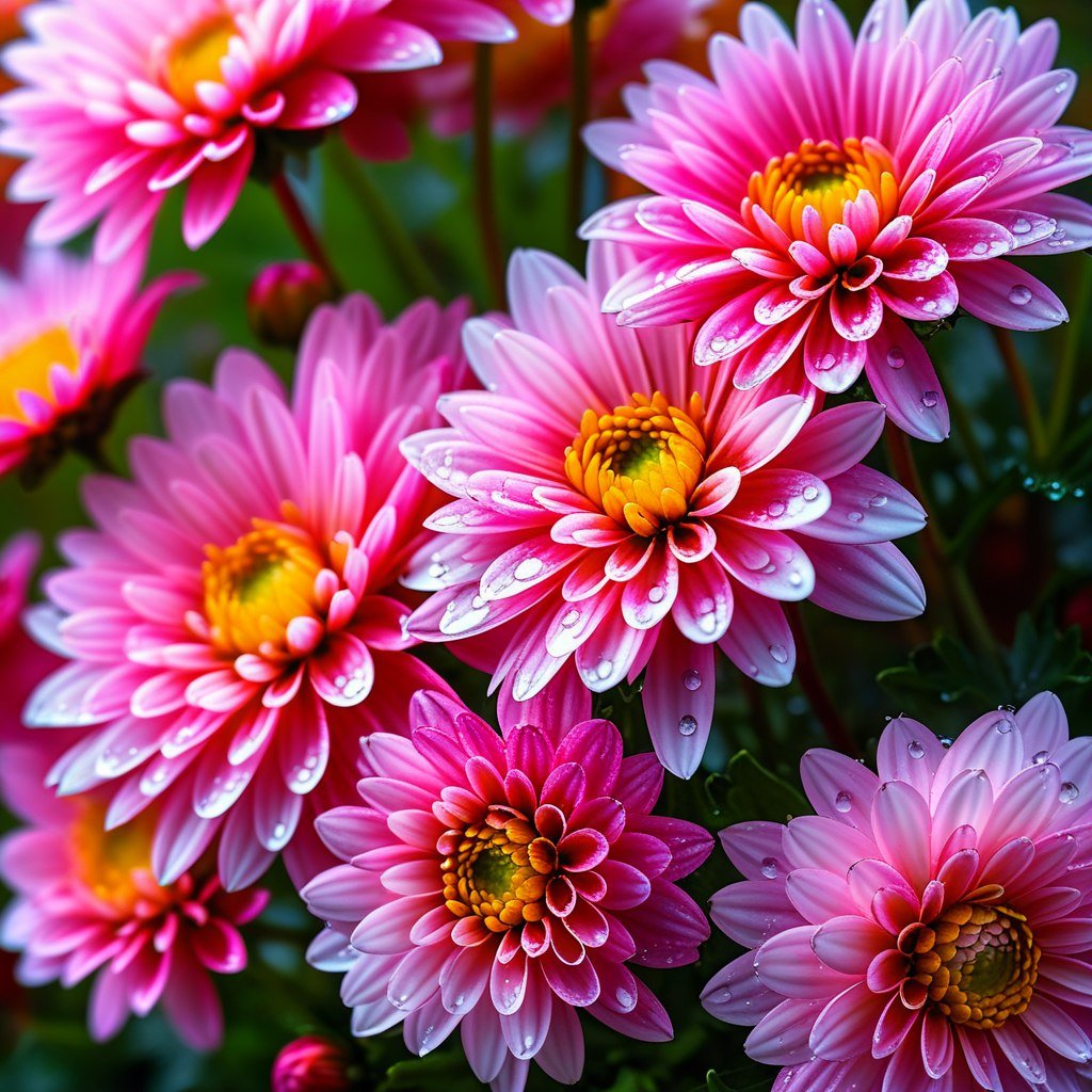 softness. Pink chrysanthemums, dew drops, the style of the artist Carol Kavalaris, autumn background. Detail, hdr