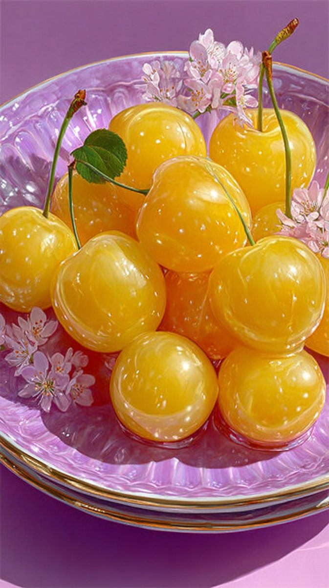 hyper realistic, photorealistic overhead view of yellow cherries, arranged neatly on a pastel-colored plate, with delicate reflections and shadows, creating an elegant food presentation style --s 750
