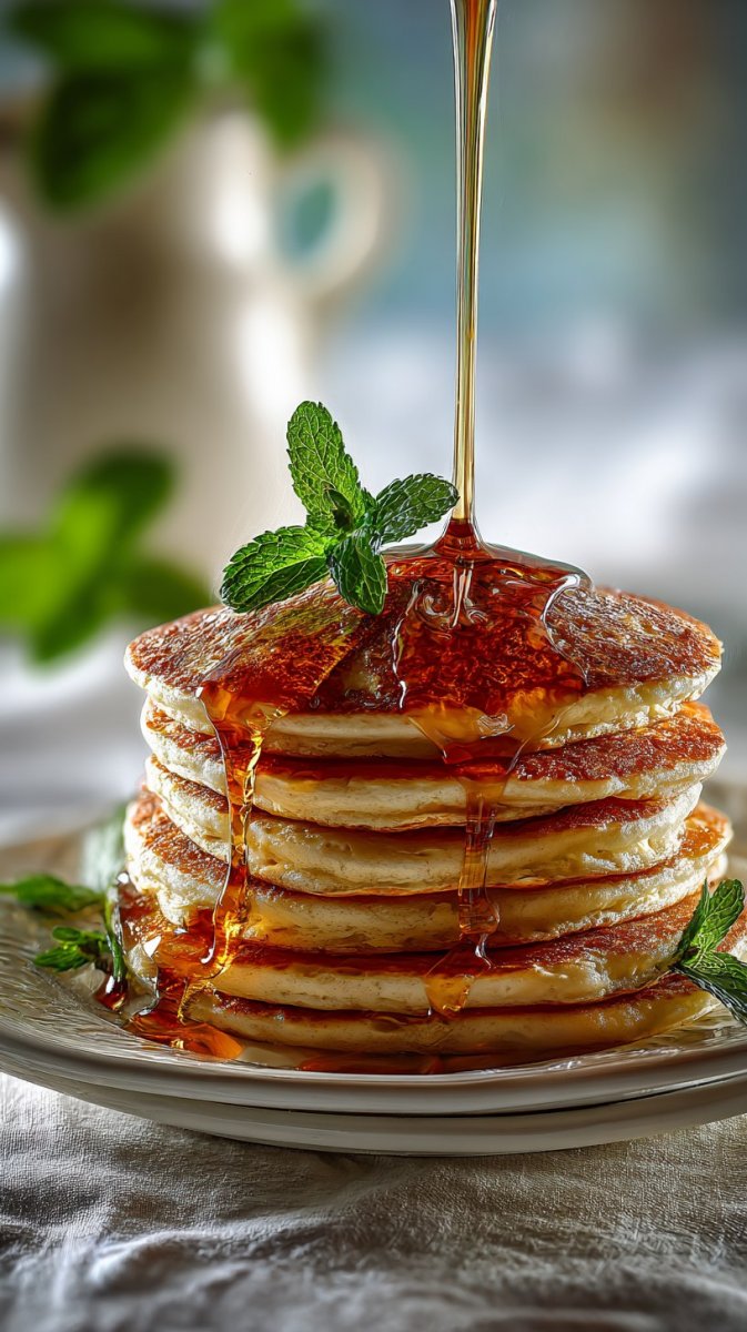 hyper realistic, photorealistic a vibrant scene featuring pancakes with cherries on top, syrup cascading down, garnished with mint leaves, set on a light colored surface for a fresh look.