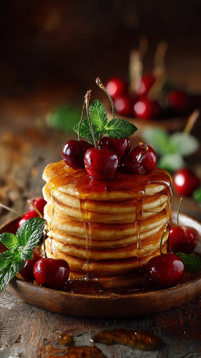 hyper realistic, photorealistic an artistic arrangement of stacked pancakes with bright red cherries, surrounded by a splash of syrup and mint leaves, on a wooden table with a warm light effect.