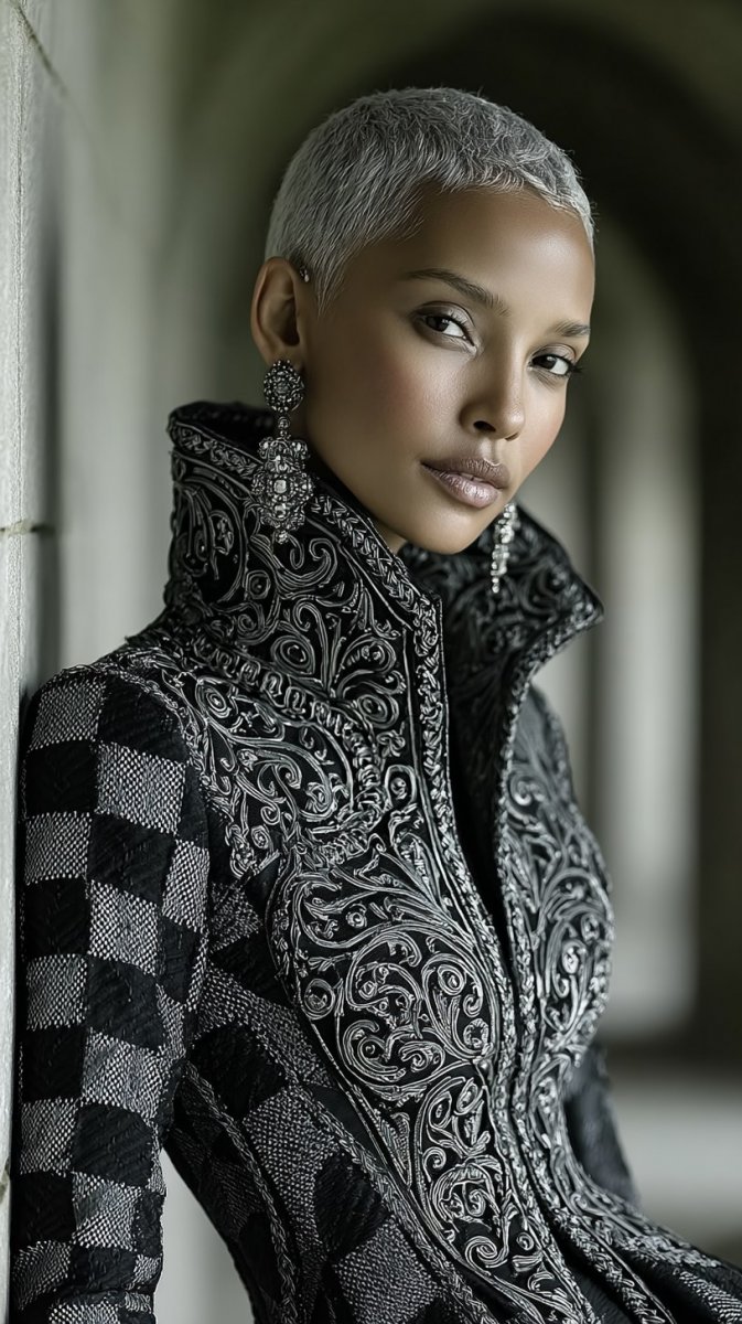 Загадочная и властная фигура предстает перед зрителем в образе женщины, облаченной в облегающий черный и белый клетчатый комбинезон. Её голову венчает величественная, крупная корона, подчеркивающая статус и уверенность. Выражение лица серьезное, даже надменное, словно она скрывает за собой множество тайн и переживаний. Вся композиция пронизана драматизмом: на фоне светлого серого пространства с приглушенными тенями зияет глубокая трещина в стене – метафора внутренних конфликтов или надвигающихся перемен. Поза модели выдержана с безупречной элегантностью и достоинством, она словно готова принять любой вызов, брошенный ей судьбой. Игра света и тени создает ощущение глубины и объема, подчеркивая фактуру ткани комбинезона и блеск короны. Этот портрет – не просто изображение женщины, а скорее аллегория силы, решительности и скрытой хрупкости. Он заставляет задуматься о цене власти, о бремени ответственности и о том, что даже самые сильные личности могут испытывать внутренние терзания. Вся картина выдержана в строгой цветовой гамме, где сочетание черного, белого и серого создает атмосферу таинственности и элегантности. Взгляд модели приковывает внимание, заставляя зрителя разгадать её секреты и понять, что скрывается за этой непроницаемой маской. Этот образ оставляет неизгладимое впечатление своей силой и загадочностью