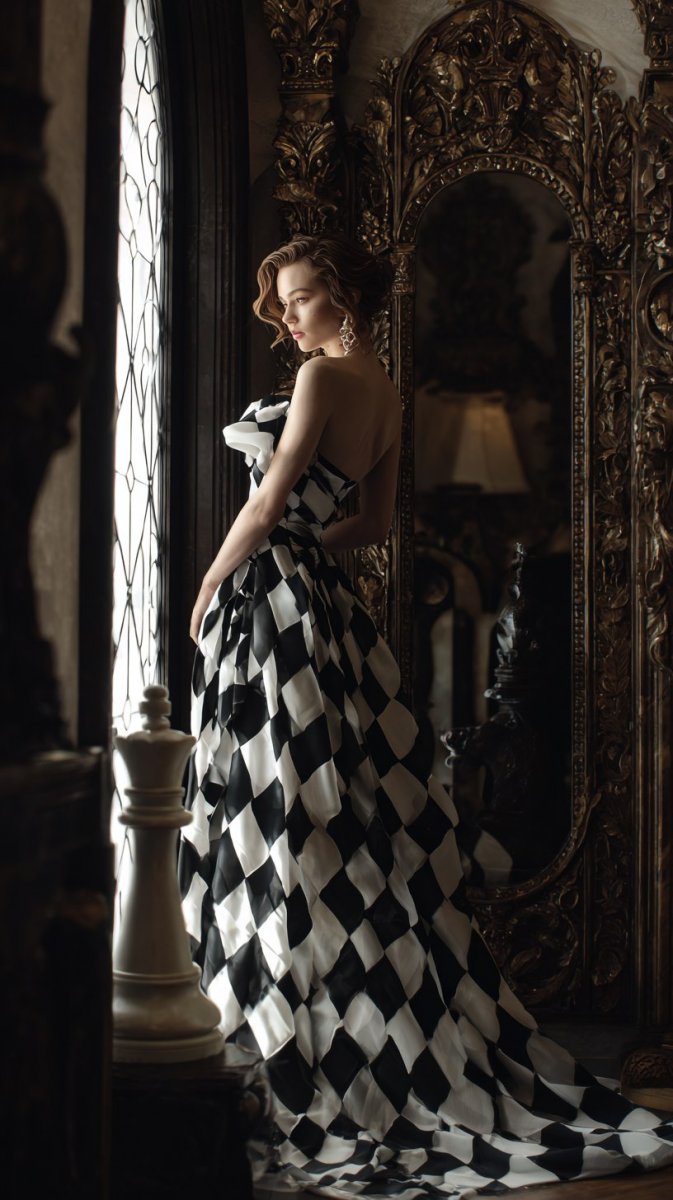 Изящная дама в роскошном платье с открытыми плечами и асимметричным подолом покоряет своей элегантностью. Черно-белая клетка ткани создает графичный контраст, добавляя образу современности и дерзости. Рядом возвышается величественная шахматная фигура, символизирующая стратегию и интеллект. Волосы, уложенные в легкие волны, придают образу женственности и легкости. За дамой простирается богато украшенный арочный проем, создающий атмосферу величия и роскоши. Композиция излучает аристократизм и изысканность, словно сошедшая с полотна классического произведения искусства. Игра света и тени подчеркивает глубину деталей и текстур, делая изображение еще более реалистичным и привлекательным. Вся сцена пронизана духом роскоши и утонченности, демонстрируя безупречный вкус и чувство стиля. Эта фотография – воплощение элегантности, силы и уверенности в себе, представляющее собой идеальный баланс между классикой и современностью. Взгляд зрителя невольно притягивается к этой завораживающей картине, полной загадочности и красоты. Это настоящее произведение искусства, способное вдохновить и подарить эстетическое наслаждение