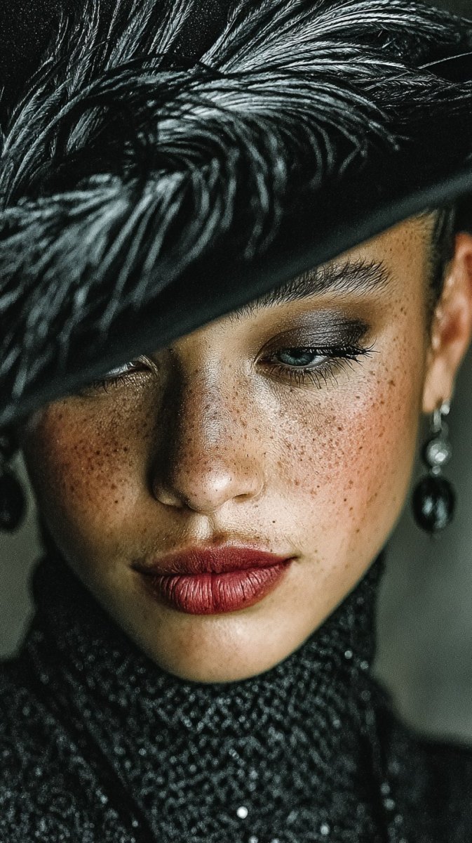 close-up portrait of woman's face with dramatic makeup, wearing large black and white feathered hat tilted to side, eyes closed in reflection, lips painted deep red, intricate collar around neck, stylish earrings glimmering, BG is textured grey wall, overall vibe is edgy and enigmatic --ar 9:16 --s 750 --style raw