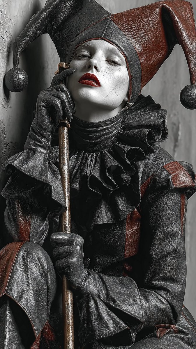 Загадочная шутница предстает перед зрителем в мрачной и сказочной атмосфере. Её образ сочетает в себе элементы готики и театральности, создавая неповторимый эффект таинственности и дерзости. Она облачена в облегающий комбинезон, который подчеркивает её фигуру, а черная маска скрывает часть лица, добавляя интриги. Воротник из воланов обрамляет лицо, акцентируя внимание на яркой помаде насыщенного красного цвета. На голове у неё огромный остроконечный колпак, украшенный помпонами – деталь, придающая образу игривость и эксцентричность. В руках она держит золотой посох, символ власти и волшебства. Фон картины представляет собой резкий контраст черно-белых тонов, что усиливает драматизм и подчеркивает одиночество героини. Её взгляд направлен прямо в камеру, вызывая ощущение прямой связи со зрителем – смелый и уверенный, он словно бросает вызов и приглашает окунуться в мир фантазий и тайн. Эта работа излучает темную элегантность и намекает на скрытую историю, полную загадок и неожиданных поворотов. Она является воплощением двойственности: сочетания серьезности и легкомыслия, красоты и уродства, света и тени. Картина завораживает своей необычностью и заставляет задуматься о природе человеческой души, её темных и светлых сторонах. Это не просто портрет – это окно в параллельный мир, где царят свои правила и законы