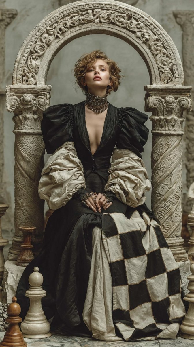 В этом завораживающем изображении запечатлена величественная женщина, стоящая перед изящным арочным проходом. Она облачена в роскошное платье с длинными струящимися рукавами и высоким воротником, выполненное в притягательном черно-белом шахматном узоре. В руках она держит крупную серебряную корону, а ее волосы ниспадают мягкими волнами, подчеркивая царственную осанку. У ног женщины хаотично разбросаны фигуры из игры в шахматы, добавляя загадочности и интриги всей композиции. Фон изображения тщательно проработан – это сложная и темная конструкция, создающая атмосферу таинственности и величия. Кажется, будто перед нами ожившая иллюстрация к сказке или фантастическому роману, где каждая деталь несет в себе скрытый смысл. Образ женщины излучает силу, уверенность и непостижимую тайну, заставляя зрителя задуматься о ее роли и предназначении в этом загадочном мире. Это визуальное произведение искусства захватывает воображение своей красотой, детализацией и глубоким символизмом, оставляя неизгладимое впечатление. Изображение выполнено в вертикальном формате с соотношением сторон 9:16, что идеально подходит для мобильных устройств или социальных сетей. Высокое разрешение и стилизация raw подчеркивают реалистичность деталей и передают всю глубину атмосферы