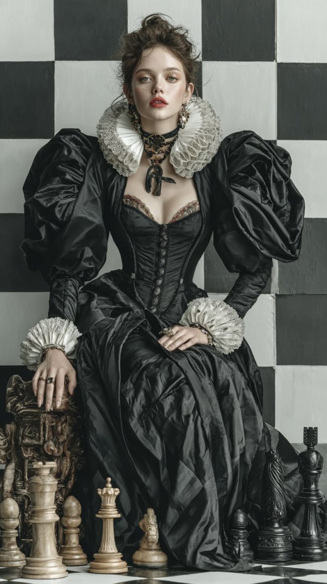 Загадочная красота в шахматном царстве. Эта завораживающая фотография представляет собой визуальную поэзию, где женщина с безупречным макияжем, напоминающим шахматную доску, становится центральной фигурой в мире черно-белой геометрии. Её длинное платье ниспадает мягкими волнами, создавая ощущение невесомости и изысканности, а высокий воротник и драматичные рукава добавляют образу театральности и таинственности. Поза женщины спокойна и грациозна – руки покоятся на боках, выражая внутреннюю силу и уверенность. Вся композиция пронизана атмосферой задумчивости и интриги, словно она является королевой в собственной шахматной партии. Аккуратно расставленные фигуры вокруг нее лишь усиливают ощущение стратегической глубины и интеллектуальной мощи. Изображение выполнено с использованием пропорции 9:16, что идеально подходит для вертикального просмотра на мобильных устройствах или в социальных сетях. Стиль raw подчеркивает естественность и необработанность кадра, позволяя зрителю полностью погрузиться в атмосферу таинственности и элегантности. Это не просто портрет – это визуальная метафора о красоте, силе и игре разума, где каждый элемент тщательно продуман для создания незабываемого впечатления. Фотография излучает ауру загадочности, приглашая зрителя разгадать тайну этой шахматной королевы и ее мира