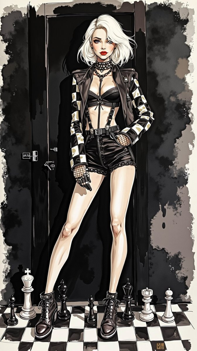 ink drawing, illustration, fashion model with long legs, wearing edgy black and white checkered outfit, striking pose against a dark wall, hair styled elegantly in platinum blonde bob, lips painted in bold red, surrounded by a few chess pieces on the floor, mood is dramatic.