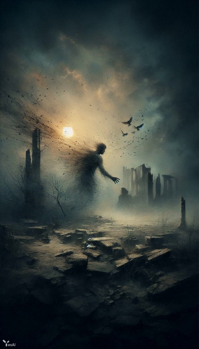 Одинокая фигура в безмолвном царстве увядания – застывший кадр из эпоса утраты и невыразимой тоски. Мягкие, приглушенные оттенки пейзажа вторят внутренней пустоте героя, словно отражая его душевную скорбь. Обветшалые строения на заднем плане — безмолвные свидетели прошедших эпох, а их разрушение символизирует хрупкость человеческого бытия и неумолимый ход времени. Силуэт, обращенный к угасающему свету, воплощает собой изнуренность, отчаяние и бесконечную тягу к надежде. Воспоминания, словно вихрь пыли, кружатся вокруг него, напоминая о прошлых радостях и потерях. Ощущение безысходности усиливается деталями разрушенных крыльев – символом утраченной свободы и неспособности взлететь над собственной болью. Единственный мерцающий огонь свечи — слабая, но упорная искра надежды в этом царстве мрака и отчаяния. Время здесь лишено хода, застывшее мгновение словно погружено в состояние анабиоза. Искаженные часы, плавящиеся на земле, подчеркивают ощущение ловушки во временном континууме, невозможность двигаться вперед и освободиться от гнетущего бремени прошлого. Картина пронизана атмосферой меланхолии и безысходности, характерной для творчества Эдварда Хоппера – мастера изображения одиночества и человеческой уязвимости в современном мире. Это визуальная поэма о хрупкости человеческого духа и вечной борьбе с отчаянием