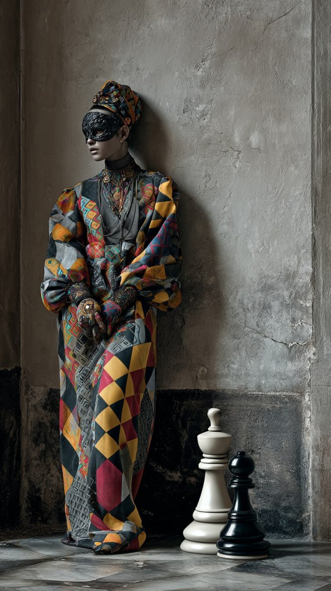 poised with one hand on her hip, a jester-like woman dons a striking black mask and colorful attire featuring bold geometric prints, her expressive eyes concealed as she leans against a cracked wall, two contrasting chess pieces subtly featured on the floor.