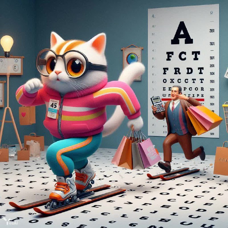 Безудержное веселье и абсурдная гонка в мире фантазий! Представьте себе: очаровательный котик, облачённый в спортивный костюм, с гордостью несёт целую охапку шоппинг-пакетов, ловко рассекая на мини-лыжах по нелепому маршруту. За ним, словно неумолимый преследователь, мчится строгий экономист, вооружённый калькулятором и символом разумного потребления – энергосберегающей лампочкой. Вокруг царит сюрреалистический хаос: под ногами котика и экономиста беспорядочно разбросаны бумажные письма, а на стенах причудливо расположена таблица проверки зрения, добавляющая ещё больше нелогичности происходящему. И в этом странном пейзаже над головами персонажей парят грациозные журавли, сложенные из бумаги оригами – символ надежды и легкости в этой безумной гонке. Это яркое сочетание юмора, абсурда и фантазии переносит зрителя в мир, где правила не действуют, а воображение становится единственным ограничением. Картина наполнена динамикой и вызывает улыбку своим неожиданным сочетанием элементов: фитнеса, шопоголизма, экономики и сюрреалистического искусства. Погрузитесь в этот забавный мир, полный странных образов и непредсказуемых поворотов! Это настоящее визуальное пиршество для любителей необычного и креативного юмора, где каждый элемент имеет свой собственный смысл, а вместе они создают поистине уникальную и запоминающуюся картину