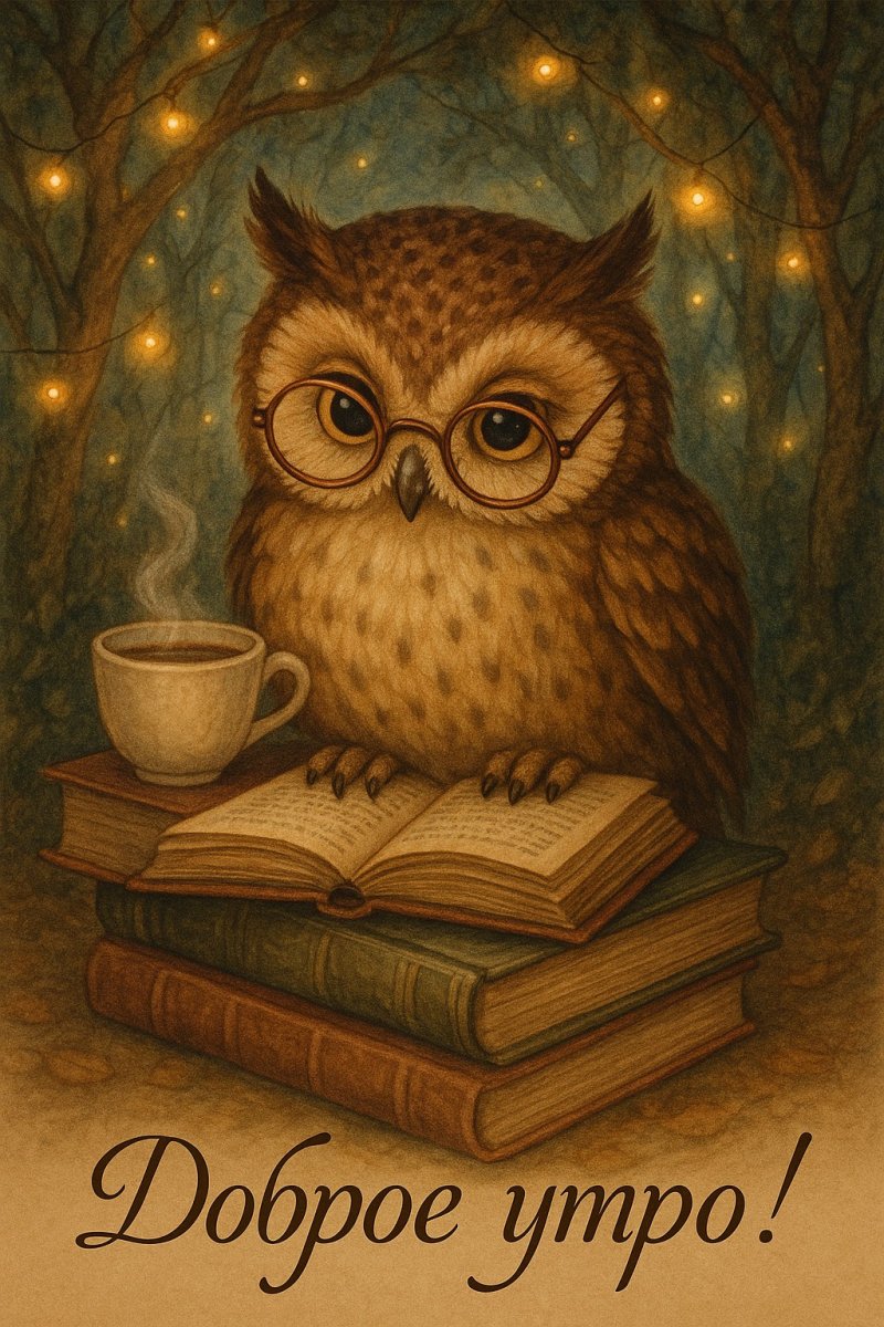 Уютное и волшебное утро в компании мудрой совы-читателя. Представьте себе: старинный лес, окутанный мягким светом мерцающих гирлянд, а на груде книг, словно правитель литературного царства, восседает сова в элегантных очках. В ее лапках – чашка ароматного кофе, наполняющая атмосферу теплом и спокойствием. Эта картина пронизана очарованием сказки и приглашает окунуться в мир знаний и вдохновения. Нежное пожелание 'Доброе утро!' написанное изящным каллиграфическим почерком, добавляет образу нежности и доброжелательности. Идеальная иллюстрация для любителей книг, кофе и волшебных историй – это визуальное воплощение утреннего вдохновения и тихой радости от возможности погрузиться в мир литературы. Насладитесь моментом покоя и гармонии с этой очаровательной совой, окруженной таинственным лесом и мерцающим светом, создавая атмосферу сказочного утра, полного надежд и новых открытий. Это больше, чем просто изображение – это приглашение к спокойствию и погружению в мир фантазий