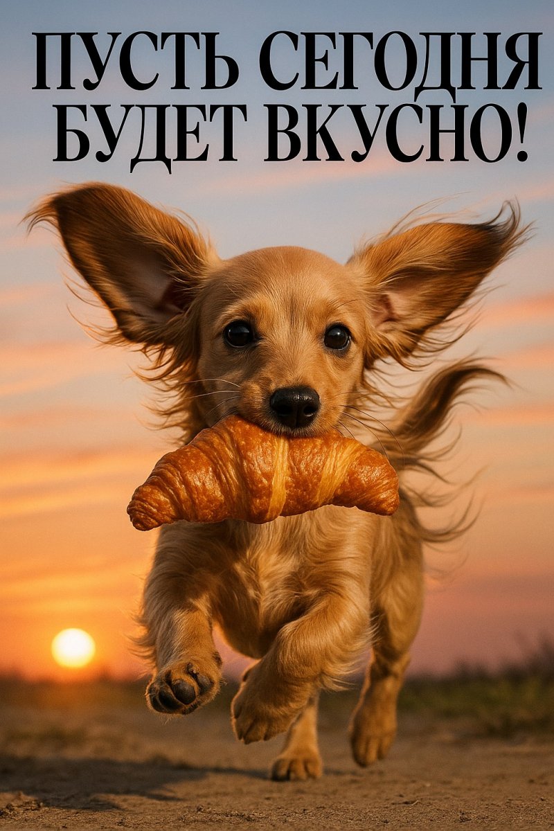 замечательный щенок с большими ушами, который быстро бежит, держит в зубах хрустящий круассан, ветер завивает его шерсть, на фоне яркого восхода и текста "Пусть сегодня будет вкусно!".
