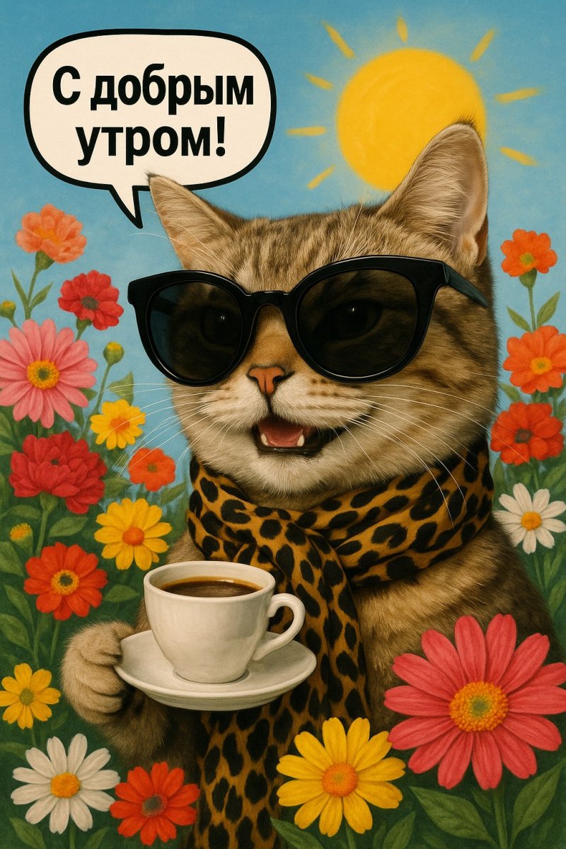 Невероятно реалистичное изображение жизнерадостного кота в стильных солнцезащитных очках, наслаждающегося утренним кофе из крошечной чашки. Его настроение передает приветствие новому дню – забавный речевой пузырь с надписью 'С добрым утром!'. Вокруг кота расцветают яркие и красочные цветы, создавая атмосферу тепла и беззаботности. Солнечное освещение подчеркивает детали изображения, делая его почти осязаемым. Кажется, будто можно почувствовать аромат свежесваренного кофе и тепло солнечных лучей. Это произведение искусства сочетает в себе юмор, реализм и позитив, вызывая улыбку и желание начать день с хорошего настроения. Идеально подходит для украшения интерьера или создания оригинального подарка любителям кошек и хорошего настроения. Яркие цвета и детальная проработка делают это изображение запоминающимся и привлекательным для широкой аудитории. Погрузитесь в мир позитива и утреннего обаяния с этим замечательным произведением искусства, которое подарит вам заряд бодрости на весь день. Изображение излучает теплоту и создает ощущение домашнего уюта, идеально подходящее для тех, кто ценит простые радости жизни. Насладитесь моментом и позвольте этому очаровательному коту зарядить вас позитивом!