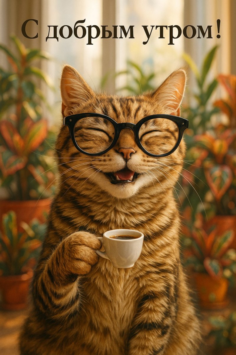 A cheerful cat wearing glasses, sipping from a tiny coffee cup, intricate details on its fur, playful expression, soft morning light filtering through a window, background full of colorful houseplants, overall mood whimsical and inviting. "С добрым утром!"