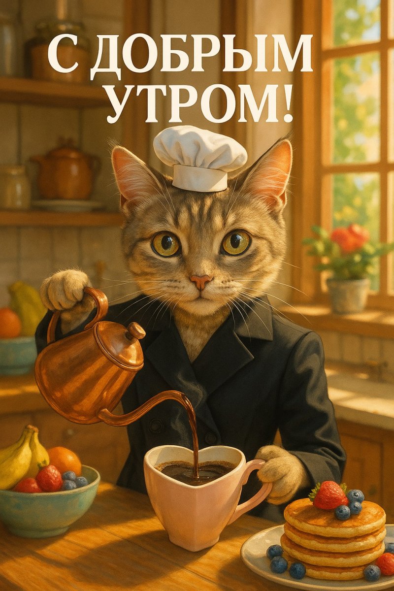A whimsical digital art piece of a cat wearing a tiny chef hat, playfully pouring steaming coffee into a heart-shaped mug. The background is a cozy kitchen filled with colorful breakfast items, like pancakes and fruits, with sunlight streaming through the window. "С добрым утром!"
