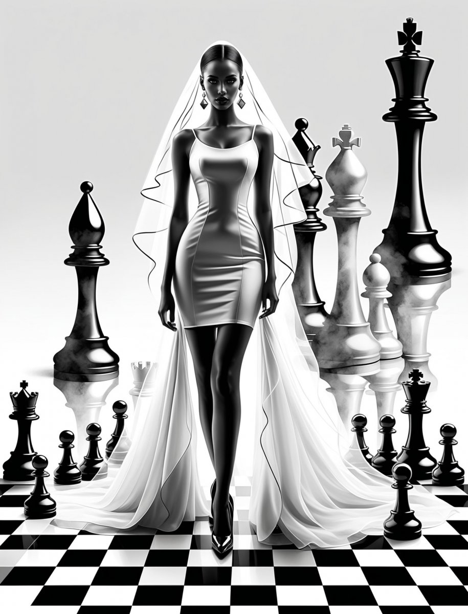 Стиль и сюрреализм: монохромная элегантность на живой шахматной доске - Пример изображения, созданного ИИ Stable Diffusion