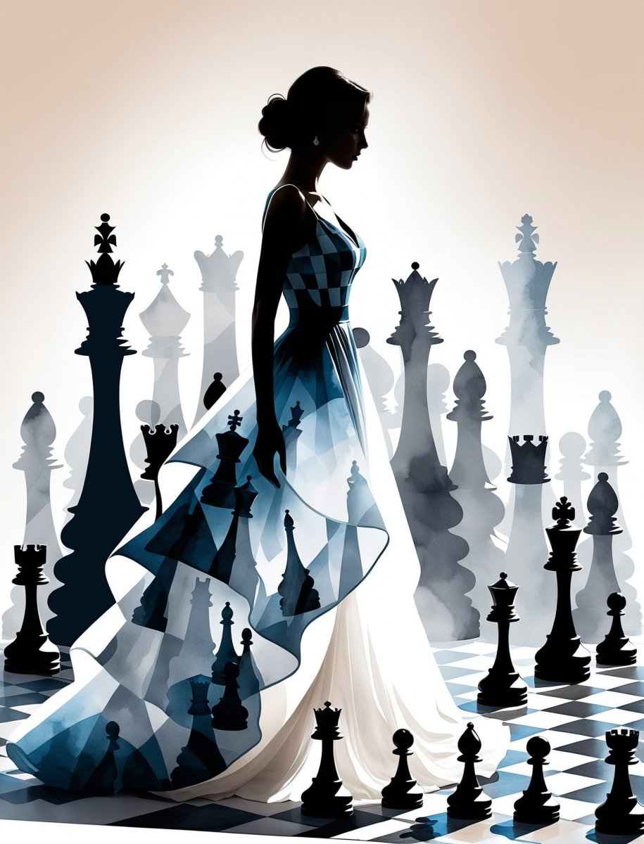double exposure, photorealistic, professional photo of a young woman in a dramatic avant-garde dress with layers of fabric resembling chess pieces cascading down her silhouette. The setting features a foggy landscape dotted with surreal chess motifs around her. In her hands, she holds an oversized chess piece that appears to be morphing into a butterfly. The contrasts of light and shadow create an enigmatic ambiance, leaving the viewer in awe of the dreamlike fusion of fashion and imagination.