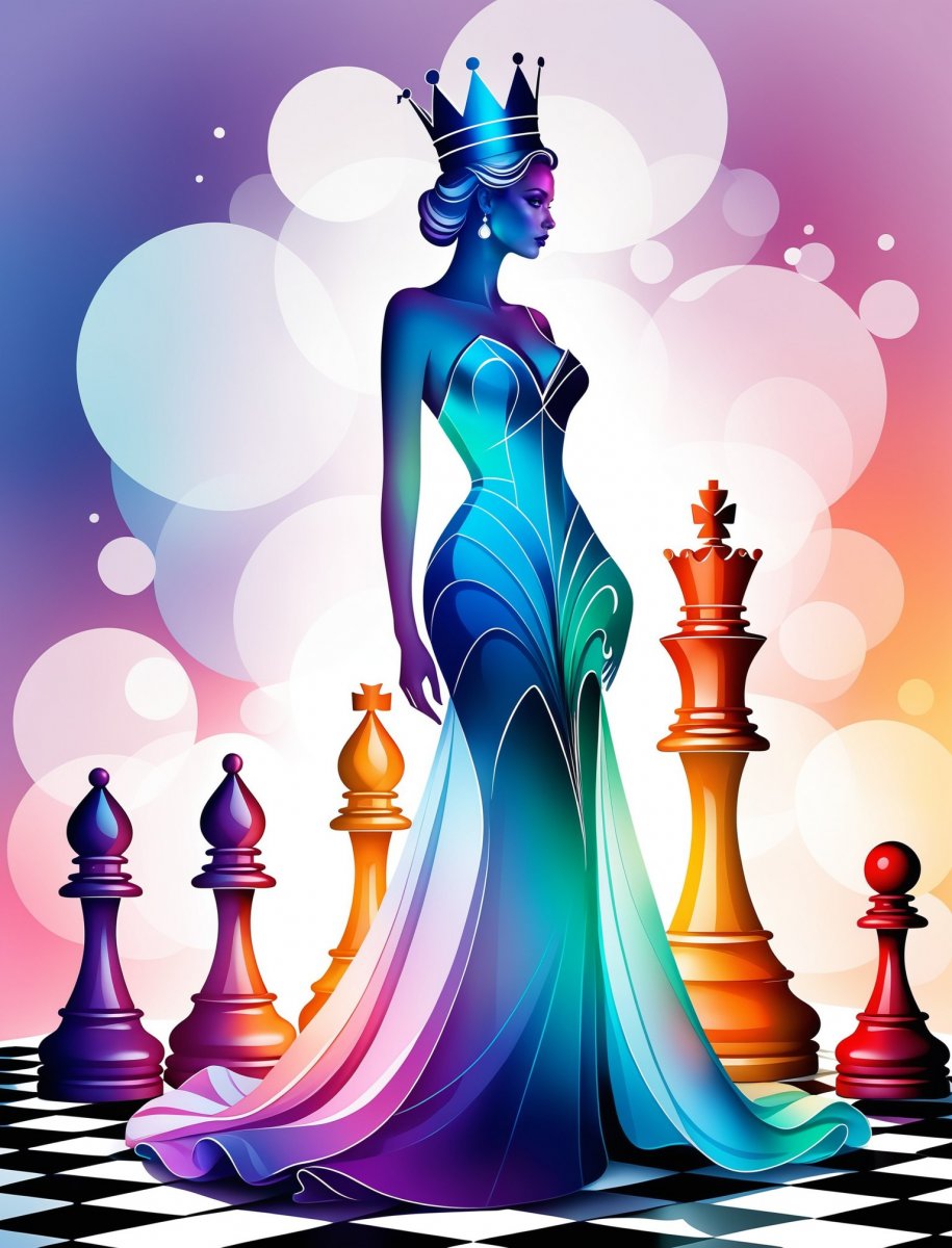 Королева в шахматном саду: эфемерная мода и сюрреалистичный свет заката - Картинка из нейросети Stable Diffusion