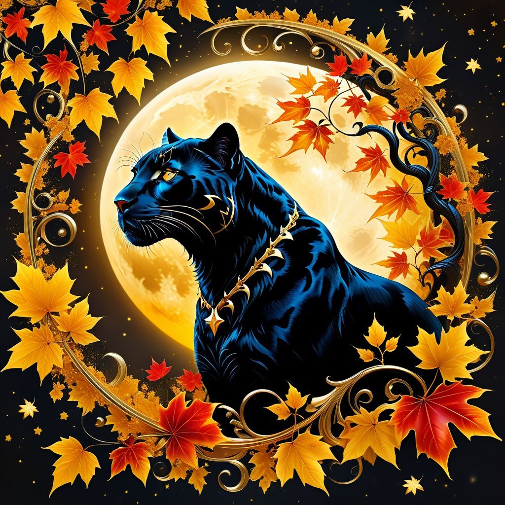 Сказочная чëрная пантера, луна золотые цветы, золотой орнамент, звездная пыль, фрактал, завитки,кленовые красно-жёлтые листья