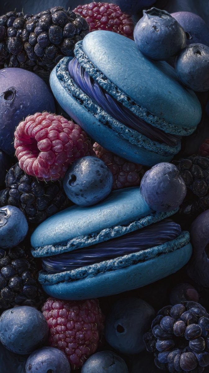 craft an image of blue macarons with blackberries, creating a visually appealing and colorful composition. the image should showcase the vibrant colors of raspberries, blueberries, blackberries, all swirling around the delicate pastries, creating a dynamic contrast between lightness and rich textures. photorealistic
