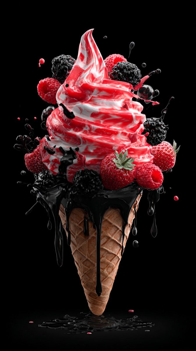 colorful ice cream cone with berries and dripping paint, black bg, mobile wallpaper, hdr, hd, hq, delicious, vibrant colors, high contrast, beautiful, octane render, hyper detailed