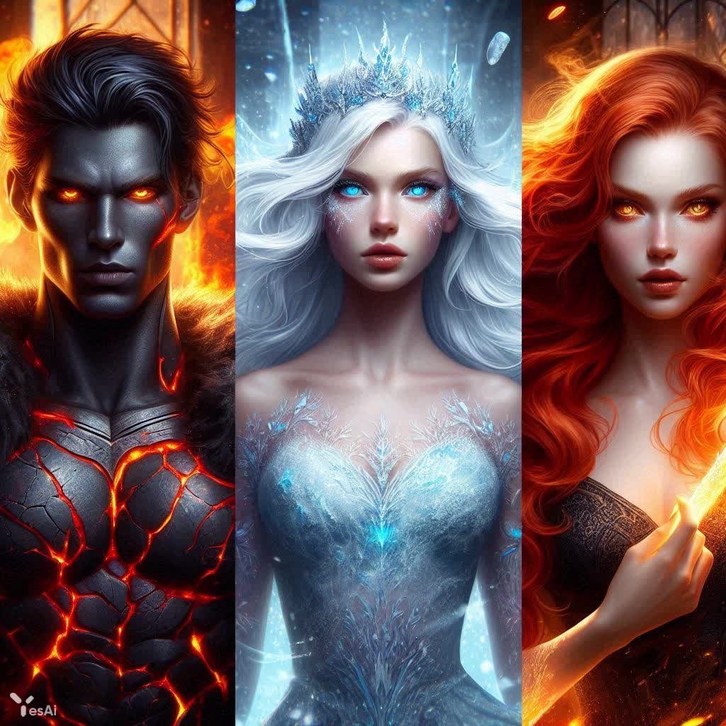 Fantasy.  A dark-skinned brunette with fiery red locks, muscular, in black and red armor with lava cracks, eyes glowing with gold. The lady of the cold, a stunning girl with long snow-white hair to her waist, in a light ice-blue dress with frost, skin pale as snow, eyes glowing Arctic blue, holding a staff of pure ice. Fair-haired with scarlet reflections, in an open shirt with smoldering coals, the skin is covered with a slight glow of heat. All three of them look at the viewer with imperious confidence, the men are the embodiment of fire and flame. Background: erupting volcanoes, rivers of lava, black sky with ash and lightning, bright colo...