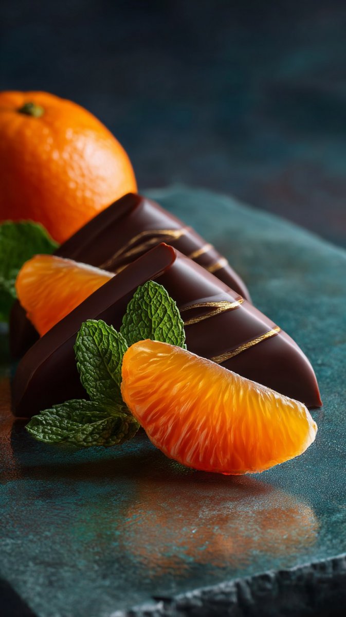 hyper realistic, photorealistic arrangement of juicy orange wedges coated in dark chocolate, garnished with mint, all presented on a dark surface for an elegant look --ar 9:16 --style raw