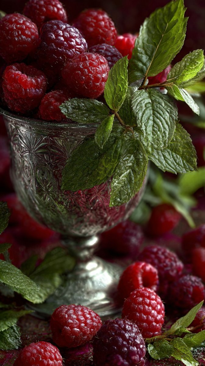 hyper realistic, photorealistic dynamic arrangement of fresh raspberries and mint leaves, creating a beautiful raspberry shake, colorful vibrant contrasts, perfect for a delicious summer treat --style raw