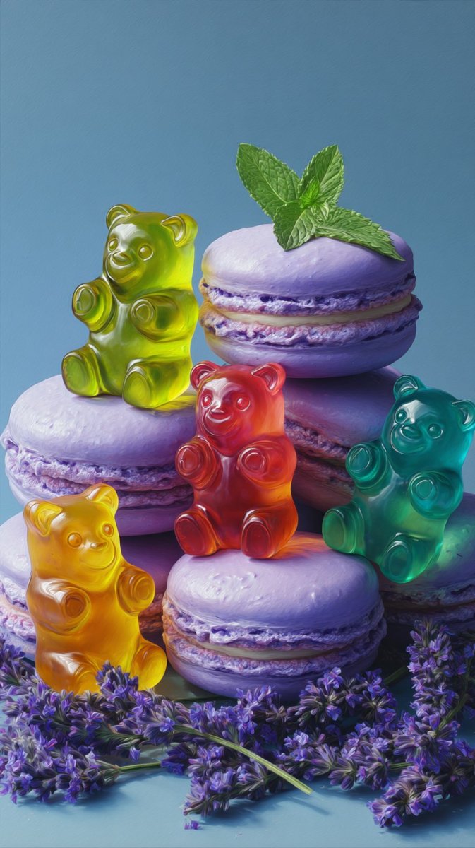 hyper realistic, photorealistic colorful gummy bears candies scattered around a pile of purple macarons with mint leaves on a white BG, soft light enhancing the vibrant textures and shapes --style raw