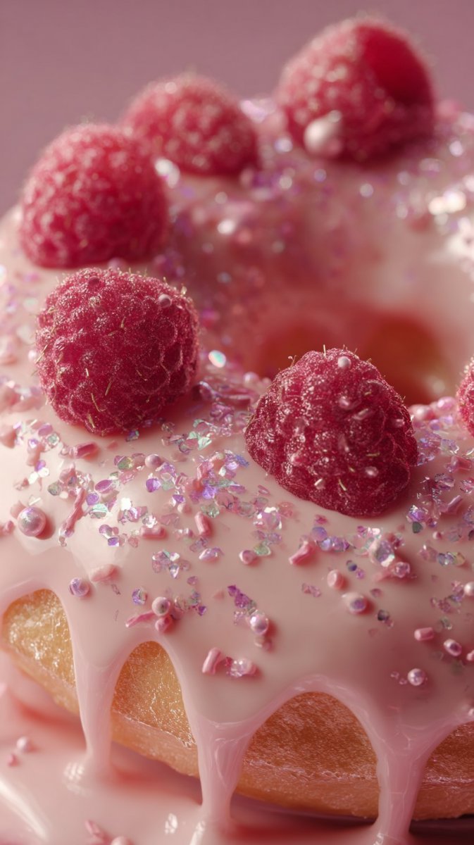 hyper realistic, photorealistic pink donut with white glaze surrounded by splashes of pink milk, raspberries scattered around, studio lighting, HDR, creating an explosion of color
