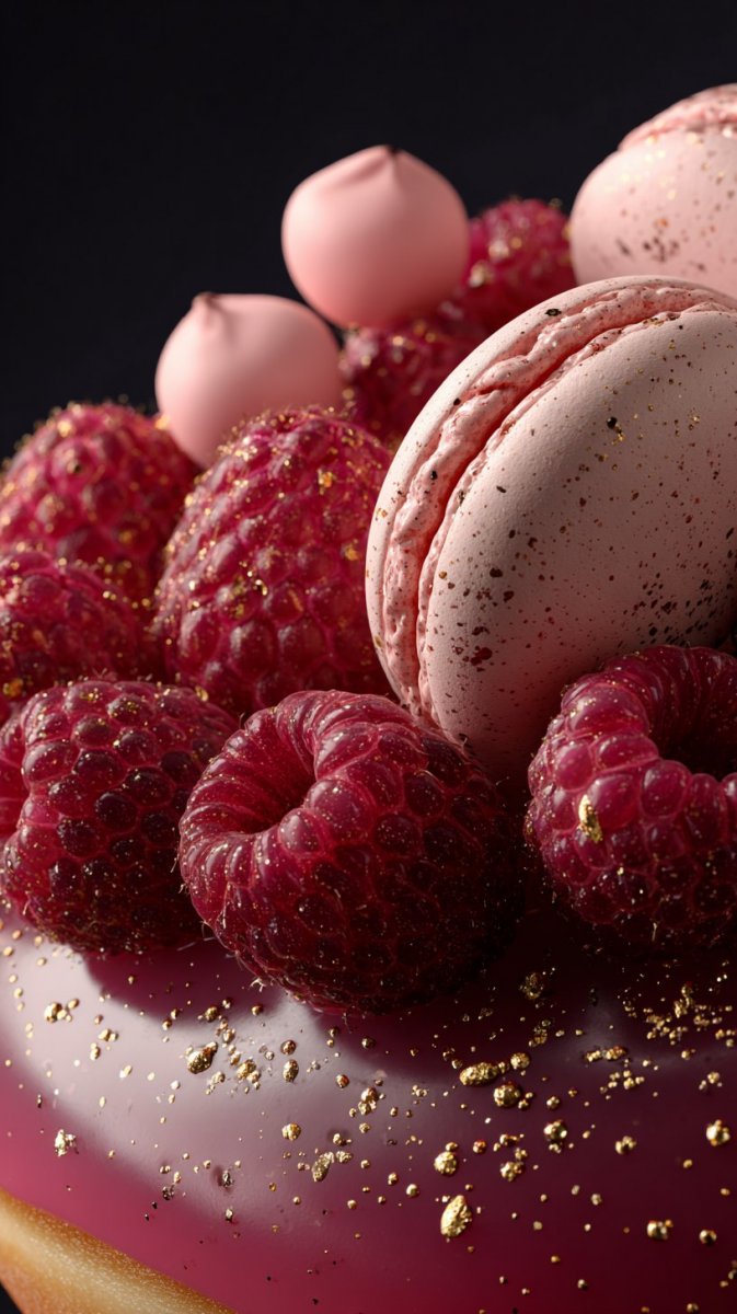 hyper realistic, a pink donut with sugar, raspberries and macarons, delicious textures, hd, black background, creating an atmosphere of freshness and vitality, creating a dynamic visual effect, shimmering with gold dust on the surface, raspberry explosion around it, fresh fruit texture