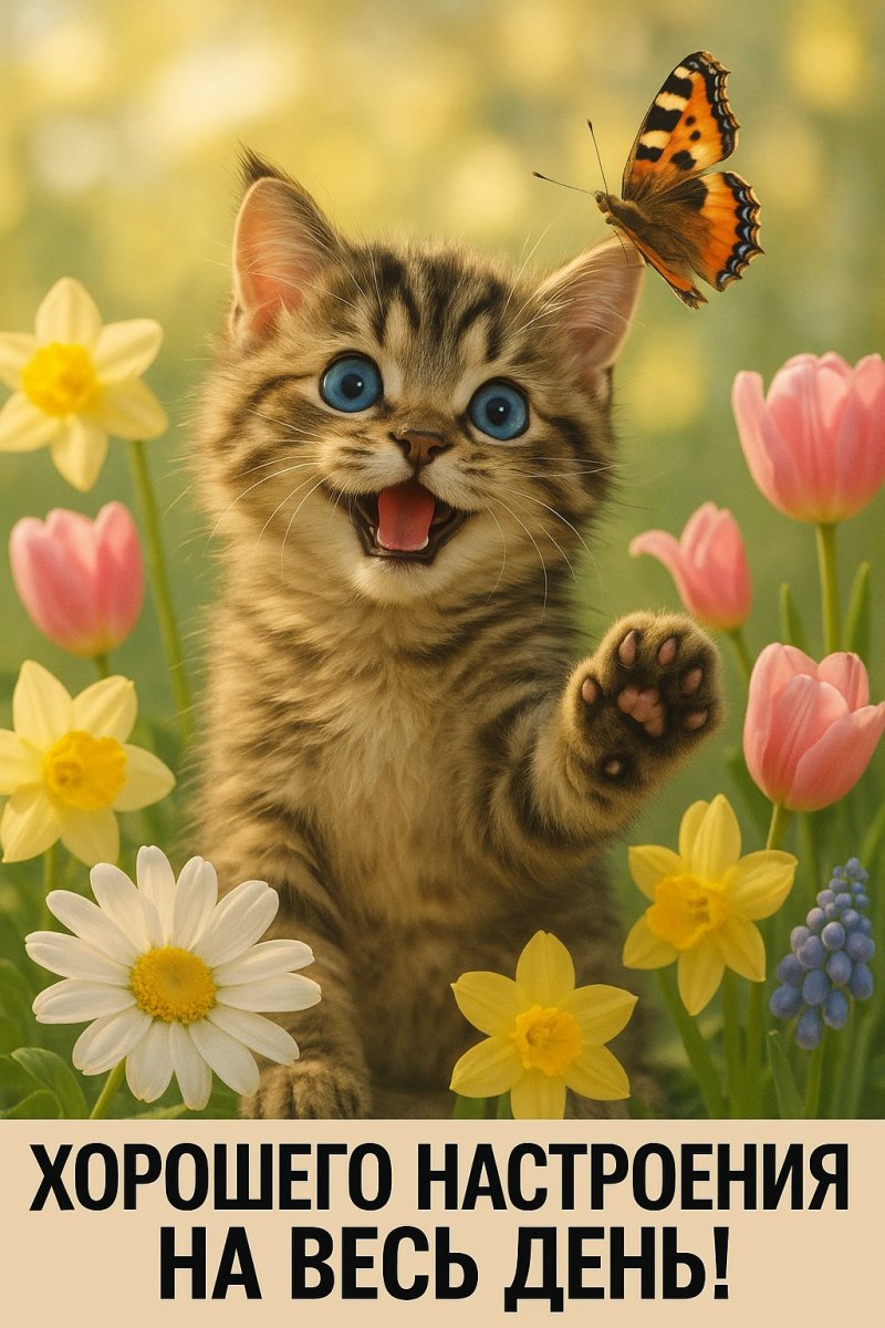 A playful funny kitten with big blue eyes, surrounded by spring flowers and butterfly, soft sunlight illuminating the scene, a whimsical, cozy vibe, "Хорошего настроения на весь день!"