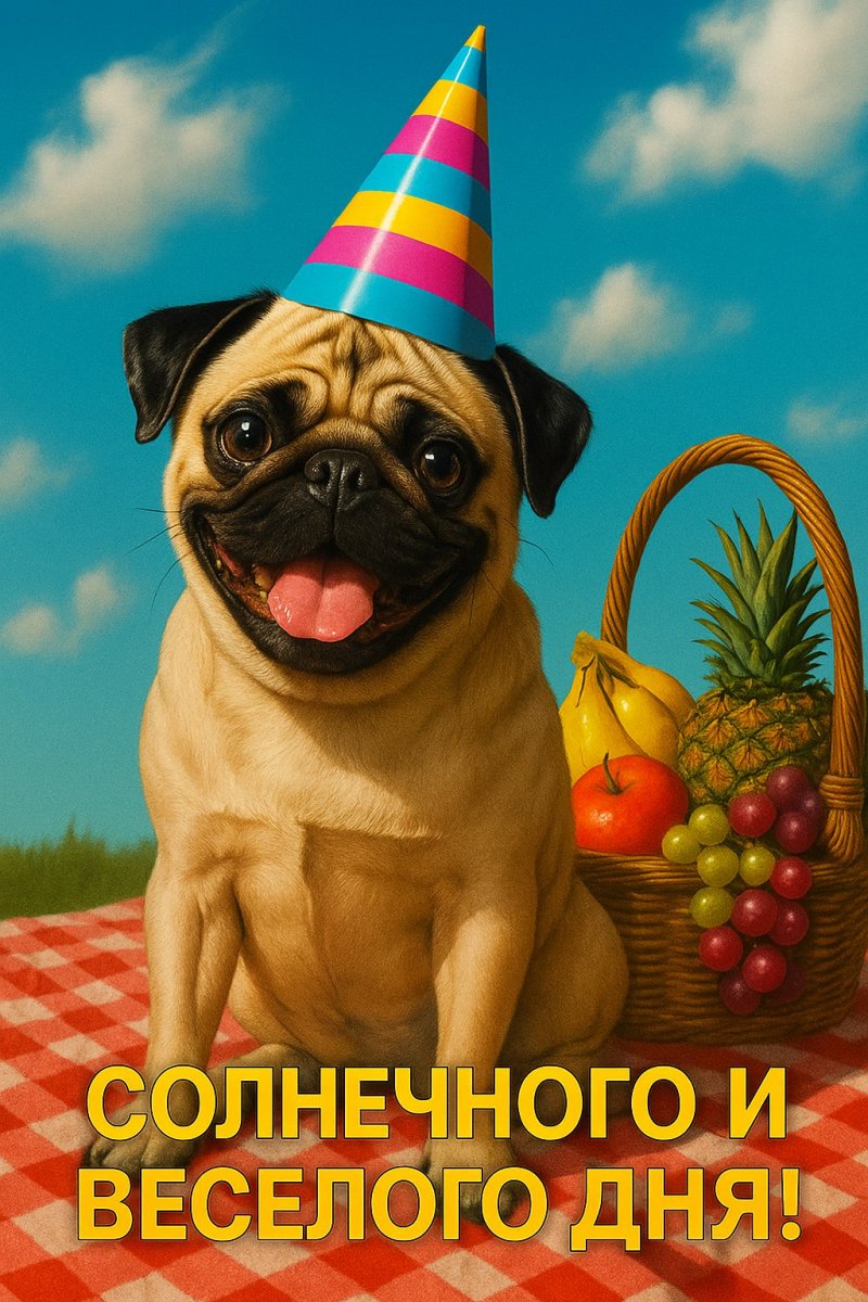 A funny dog pug wearing a bright party hat, sitting on a picnic blanket with a fruit basket, a blue sky with fluffy clouds in the background, playful expression, vibrant colors, "Солнечного и веселого дня!"