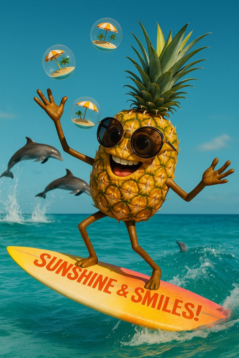 Photorealistic depiction of a cheerful pineapple juggling tiny beach balls while balancing on a surfboard with the words "Sunshine Smiles!" painted on it, turquoise ocean backdrop with playful dolphins leaping.
