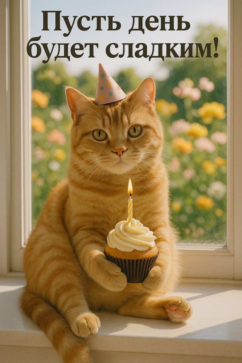 Очаровательный рыжий котик в крошечной праздничной шапочке восседает на подоконнике, откуда открывается вид на залитый солнцем сад. Его лапки бережно держат капкейк со свечой, создавая атмосферу радости и беззаботности. На заднем плане распускаются яркие цветы, а среди них выведено трогательное пожелание 'Пусть день будет сладким!'. Эта картина словно сошла с открытки, наполненной теплом, уютом и предвкушением чего-то особенного. Идеальный момент для наслаждения маленькими радостями жизни и дегустации вкуснейшего лакомства. Воображение рисует картинку идеального дня, когда солнце ласково согревает, а вокруг царит атмосфера праздника и любви. Этот котик – настоящий символ счастья и позитива, готовый разделить с вами эту сладкую и неповторимую атмосферу. Он словно говорит: 'Забудьте о заботах и наслаждайтесь моментом!' Именно такие милые детали делают нашу жизнь ярче и запоминаются надолго. Это не просто фотография – это частичка волшебства, способная поднять настроение даже в самый пасмурный день. Позвольте себе окунуться в мир тепла и уюта, где каждый день - маленький праздник!