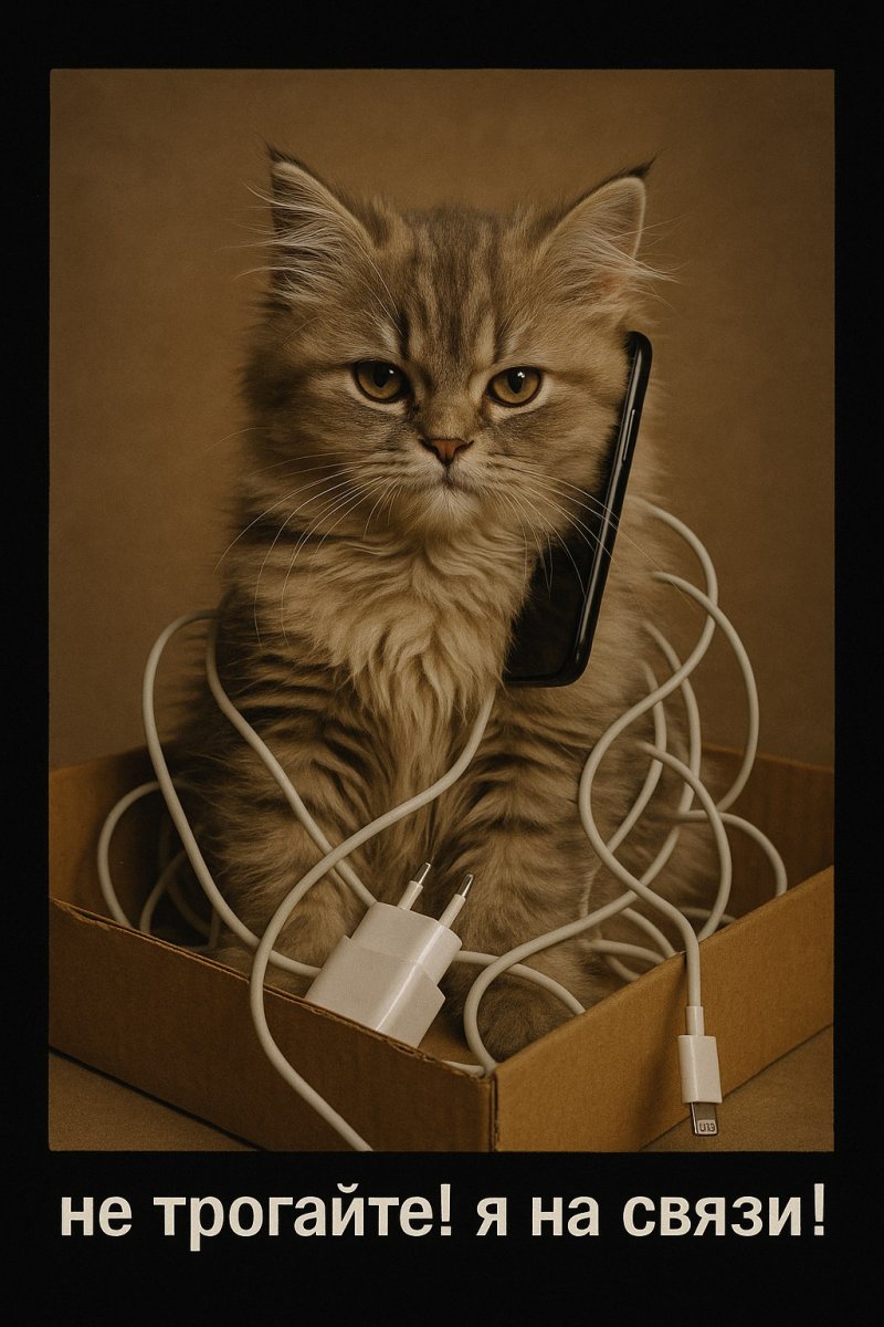photo on film, black frame, text in white letters on the black frame: "Не трогайте! Я на связи!", a fluffy kitten surrounded by tangled phone chargers, sitting in a cardboard box with a serious expression, as if it’s deeply engaged in a conference call.