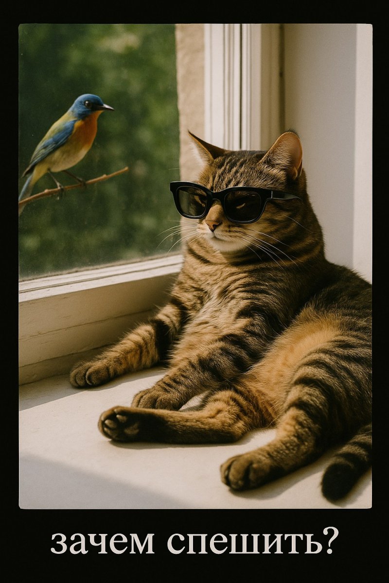 Безмятежность в черно-белом кадре. Этот снимок, словно выхваченный из ленты старой кинопленки, запечатлел момент абсолютного спокойствия и расслабленности. Ленивый полосатый котик, удобно расположившись на залитом солнцем подоконнике, излучает умиротворение. На его мордочке – стильные солнцезащитные очки, добавляющие образу непринужденной крутости. Яркая птица за окном вызывает лишь равнодушный взгляд питомца; он полностью поглощен своим состоянием блаженства и игнорирует внешние раздражители. Надпись белыми буквами на черной окантовке – Зачем спешить? – идеально отражает атмосферу кадра, призывая замедлиться и насладиться простыми радостями жизни. Это визуальная поэма о беззаботности и умении находить гармонию в моменте. Фотография излучает тепло солнца и уют домашнего очага, создавая ощущение тепла и защищенности. Кажется, что время замерло, позволяя зрителю окунуться в мир покоя и релаксации вместе с этим очаровательным котом. Снимок – настоящая ода ленивым летним дням и умению ценить тишину. Это больше, чем просто изображение кота; это философия жизни, призывающая к осознанности и наслаждению каждым мгновением