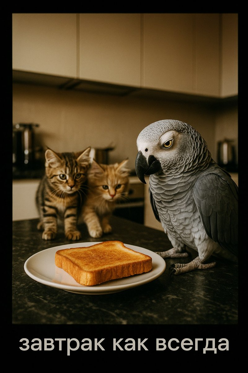 photo on film, black frame, text in white letters on the black frame: "Завтрак как всегда", a disgruntled parrot perched on a kitchen counter, eyeing a plate of toast with a suspicious look while two mischievous kittens sneak behind it, plotting to steal the food.