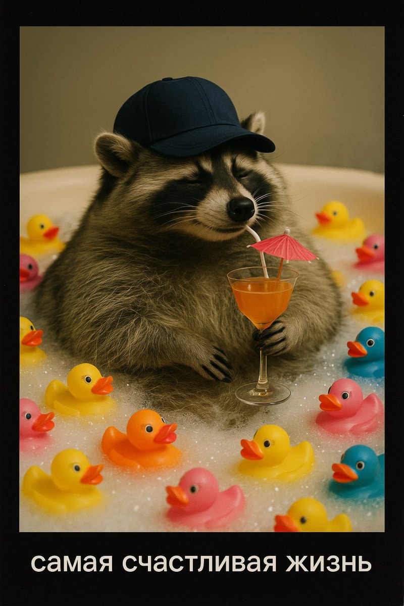sora Счастливый енот в ванне с уточками и коктейлем. Генерация из нейросети Sora Image