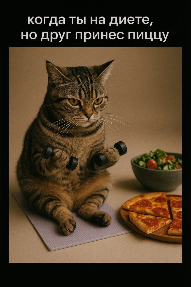 photo on film, black frame, text in white letters on the black frame: "Когда ты на диете, но друг принес пиццу", a determined-looking tabby cat sitting at a tiny yoga mat, with pizza slices and a salad bowl next to it, looking longingly at the pizza while exercising with tiny dumbbells.