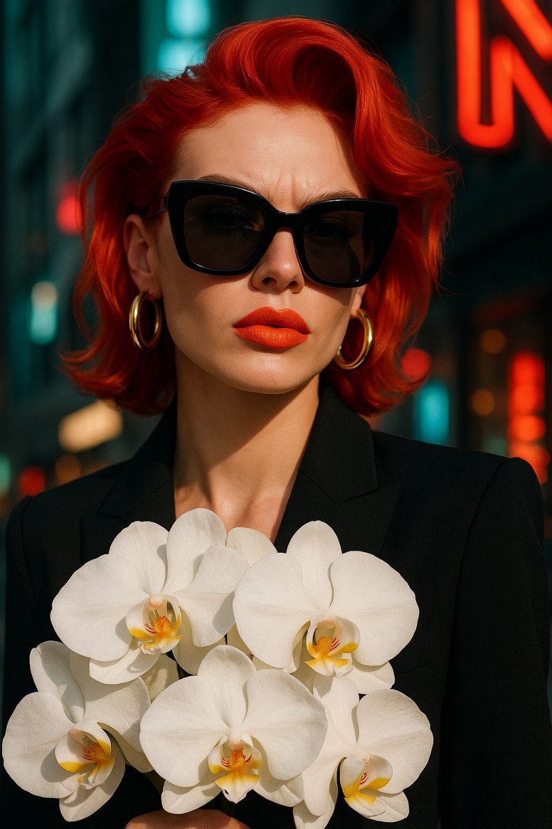 fierce fashionista with vibrant red hair, wearing oversized sunglasses, holding a bouquet of white orchids, close-up of her vibrant coral lipstick contrasting with her gold hoop earrings, modern downtown vibe with neon signs in the background.
