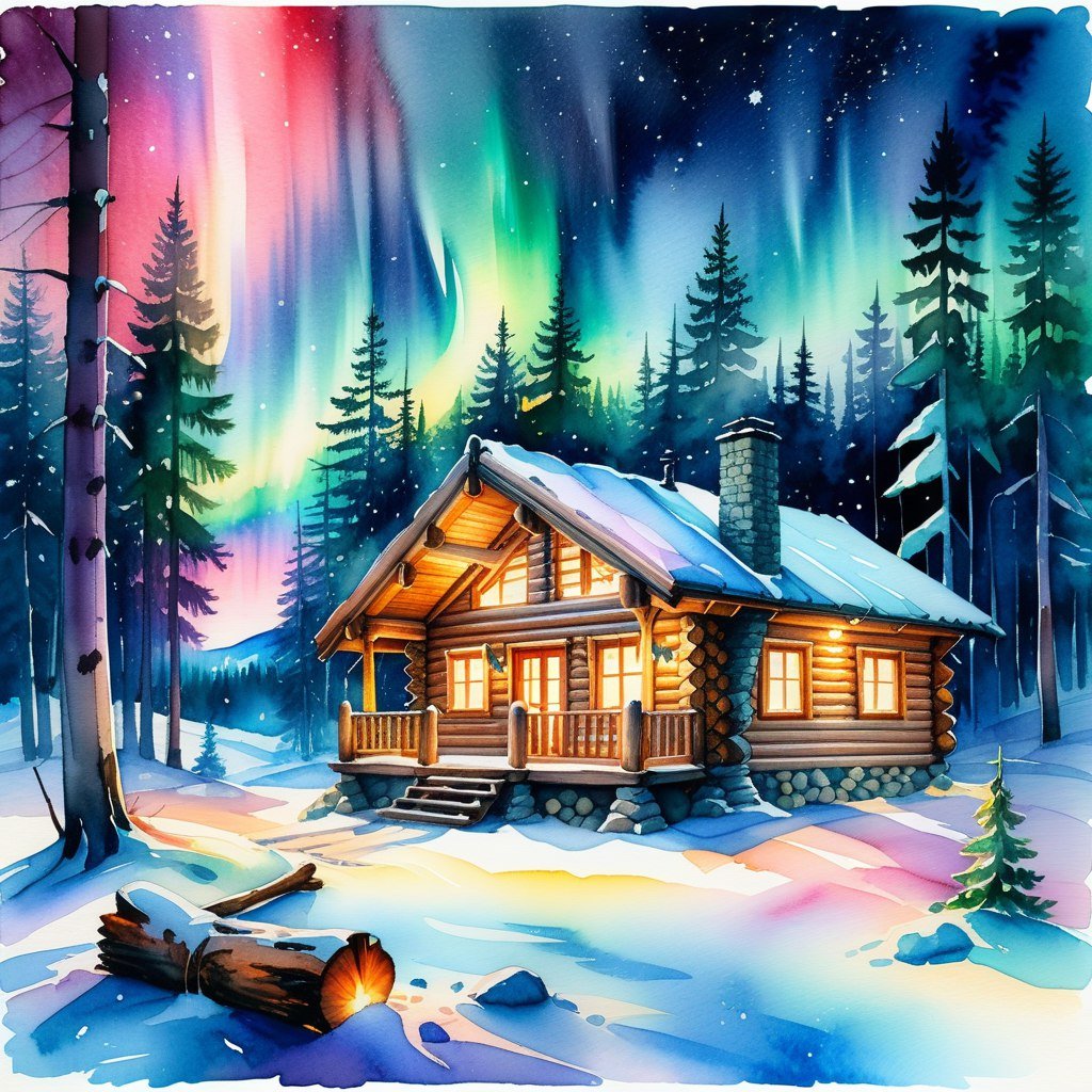 Акварельный рисунок уютной бревенчатой избушки в заснеженном лесу ночью, теплый свет в окнах, северное сияние в небе, волшебная и спокойная атмосфера