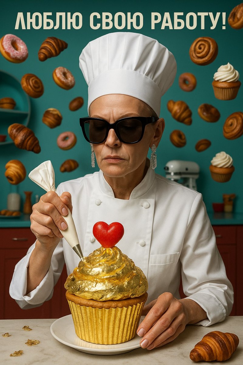Изображение поражает своей гиперреалистичной детализацией и необычным сочетанием элементов. В центре внимания – строгий шеф-повар, одновременно являющийся нейросетевым создателем, с предельной сосредоточенностью украшающий огромный кекс съедобным золотым листом и сахарными сердечками красного цвета. Его образ дополняют экстравагантные детали: массивные солнцезащитные очки и бриллиантовые серьги, подчеркивающие его яркую индивидуальность и творческий подход. Фоном служит стилизованная кухня, выполненная в ярких тонах, словно ожившая благодаря множеству парящих десертов – тортов, пирожных и печенья, создающих атмосферу сказочного кондитерского царства. Над всем этим возвышается надпись Люблю свою работу!, выражающая искреннюю страсть шеф-повара к своему делу и демонстрирующая его безграничную креативность. В целом, изображение представляет собой яркое сочетание кулинарного искусства, высоких технологий и безудержной фантазии, создавая ощущение праздника и вдохновения. Оно демонстрирует не просто процесс приготовления десерта, а воплощение творческого гения, где каждый элемент тщательно продуман и выполнен с максимальной точностью. Это произведение искусства, которое заставляет задуматься о красоте, мастерстве и радости от любимой работы