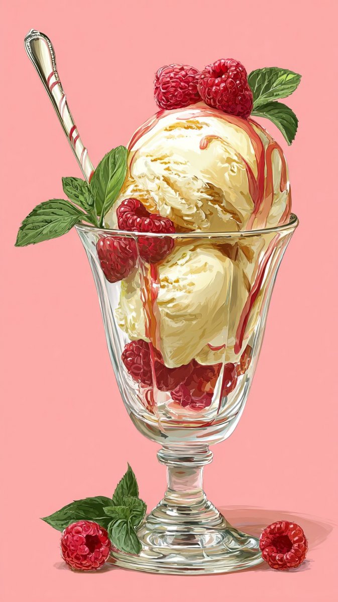 Изысканная акварельная иллюстрация, передающая атмосферу летнего наслаждения и свежести. В центре композиции – аппетитный десерт: мороженое сандей с сочными малиной, щедро украшающей верхнюю часть. Легкий стеклянный бокал, в котором подается лакомство, дополнен стильным красным и белым полосатым соломинкой, добавляя шарма и игривости образу. Нежные розовые завитки мороженого создают ощущение воздушности и легкости, а теплая цветовая палитра согревает взгляд и вызывает приятные ассоциации с солнечным днем. Свежая малина, хаотично разбросанная вокруг бокала, подчеркивает натуральность ингредиентов и усиливает визуальный эффект свежести. Эта картина – воплощение летнего настроения, сладкого удовольствия и эстетического наслаждения деталями. Идеально подойдет для иллюстраций кулинарных книг, меню кафе или дизайна упаковки десертных продуктов, создавая ощущение легкости, свежести и неповторимого вкуса. Она способна вызвать у зрителя приятные воспоминания о летних днях и пробудить желание насладиться этим прекрасным лакомством. Использование акварельной техники придает изображению особую мягкость и нежность, делая его визуально привлекательным и запоминающимся