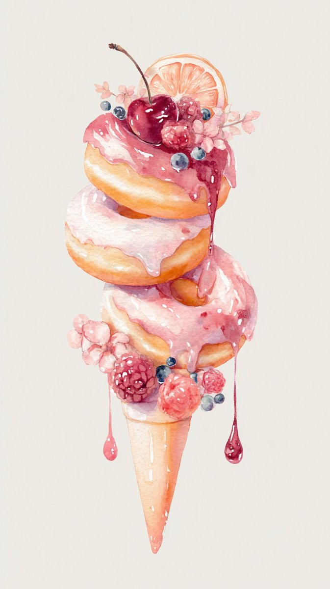 watercolor painting of three donuts stacked, cone made of waffle cone, decorated with fresh berries, drizzle of sauce over sides, sliced oranges, raspberries overlapping, overall mood romantic and whimsical style.