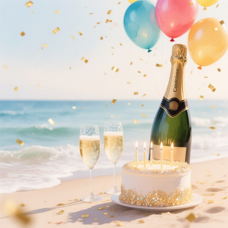 Create a festive greeting card: an enormous champagne bottle, champagne flutes filled with bubbles, a lavishly decorated cake with sparkling candles, colorful helium-filled balloons floating above, golden confetti sprinkled all over, set on the shore of a southern sea with gentle waves lapping at the sand, elegant, luxurious, creamy blurred background, soft pastel tones, watercolor style.